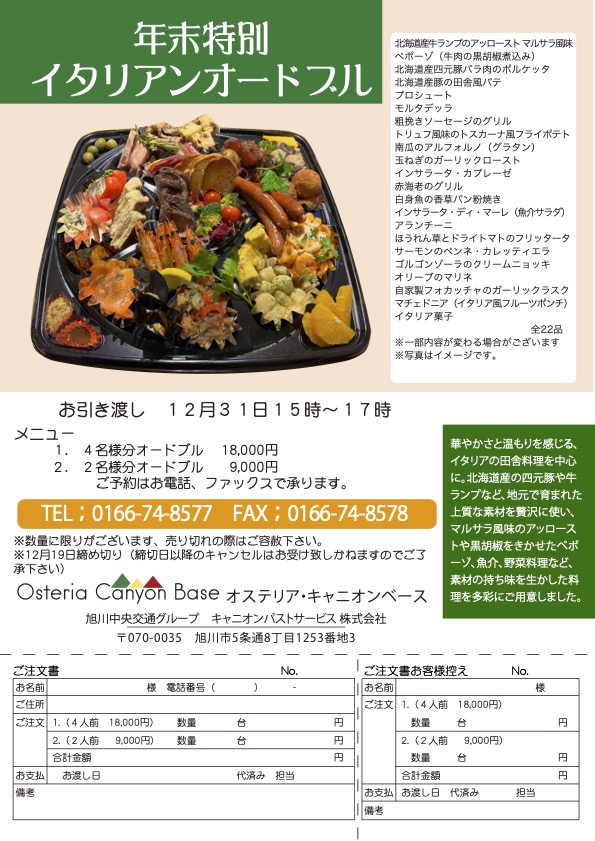 年末特別イタリアンオードブルです。ご予約お待ちして居ります。